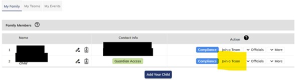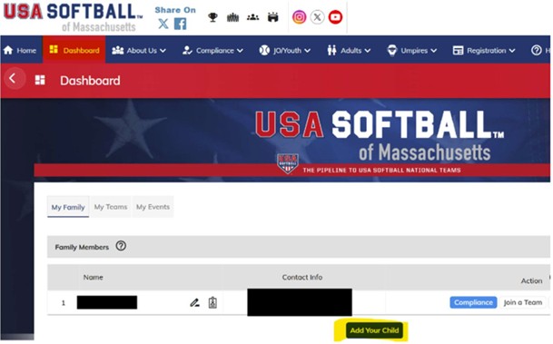 Go to the Dashboard tab; if your child is not shown click Add Your Child: